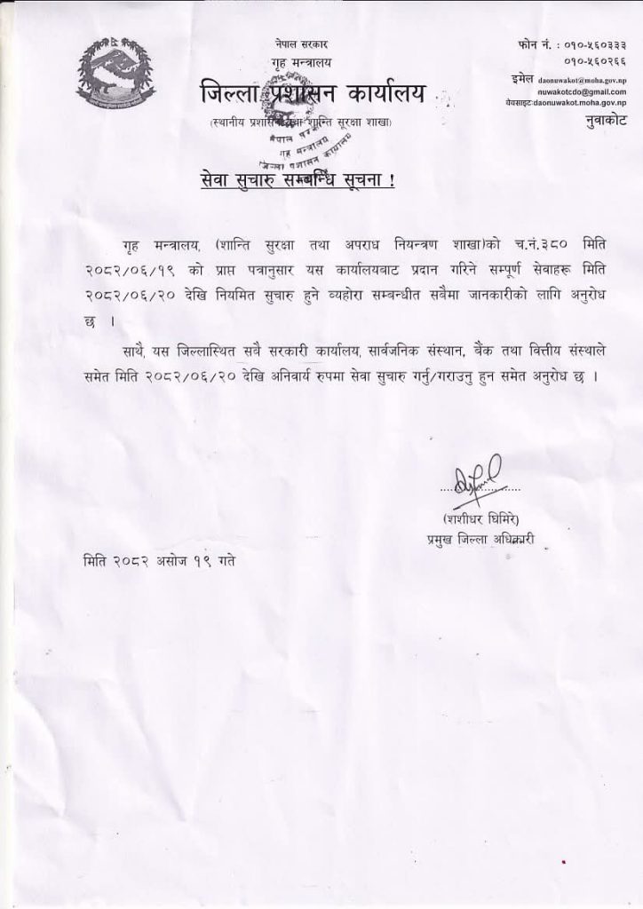 त्यसअनुसार नुवाकोटका सबै सरकारी सेवा पुनः सञ्चालनमा आएका छन्।