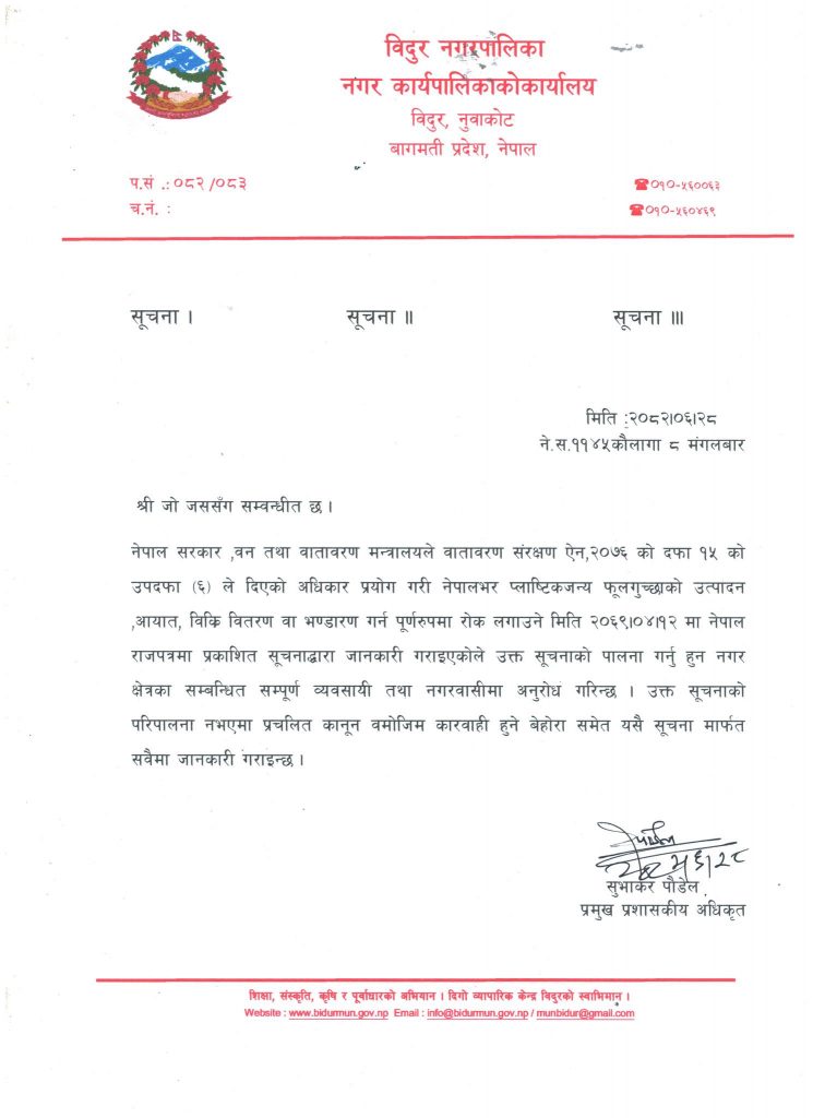 नुवाकाेट ।नुवाकाेटको विदुर नगरपालिकाले प्लाष्टिकको फूल बिक्री, वितरण तथा उत्पादनमा रोक लगाएको छ ।