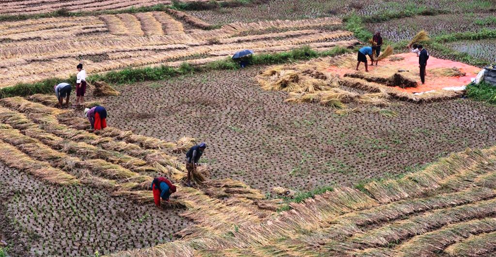 लगातारको सिमसिमे वर्षाका बीच पनि आज किसान धान काट्ने, चुट्ने र भित्र्याउने काममा जुटिरहेका छन् ।चाडपर्वका कारण पाकिसकेको धान समयमा नै भित्र्याउन नपाउँदा बाला झुरिएर झर्ने अवस्था देखिएको र अझ ढिला गर्दा थप क्षति हुने चिन्ताले किसान वर्षालाई बेवास्ता गर्दै हतार–हतार धान भित्र्याउन व्यस्त भएका छन्।