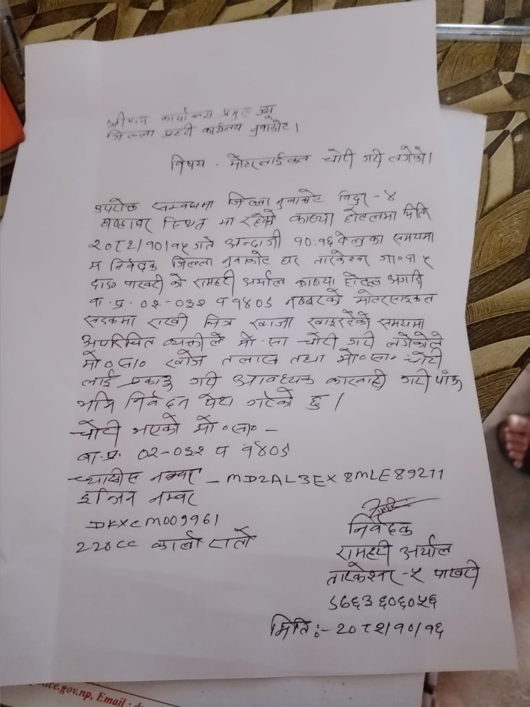 मोटरसाईकल हराएको विषयमा जिल्ला प्रहरी कार्यालय नुवाकोटमा पनि उजुरी दिइएको छ ।
