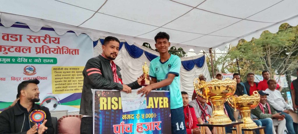 प्रतियोगितामा विदुर ९ का तेज घले उत्कृष्ट खेलाडी घोषित भए भने विदुर ६ का उमेश कुमाल उदयमान खेलाडी घोषित बने । त्यस्तै उत्कृष्ट गोलरक्षक विदुर ६ का समर श्रेष्ठ बन्दा उत्कृष्ट डिफेन्डर विदुर ६ कै सन्तोष केसी घोषित भए । त्यस्तै प्रतियोगितामा धेरै गोल गरेका विदुर ९ का ईमान तामाङ उच्च गोलकर्ता बने । उनीहरुले समान ५ हजार रुपैयाँ हात पारे ।