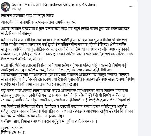 सोमवार सामाजिक संजाल फेसबुक मार्फत आफ्नो धारणा राख्दै उनले आसन्न निर्वाचन प्रक्रियामा आफु कुनै पनि रूपमा सहभागी नहुने निर्णय गरेको उल्लेख गरेका छन् ।