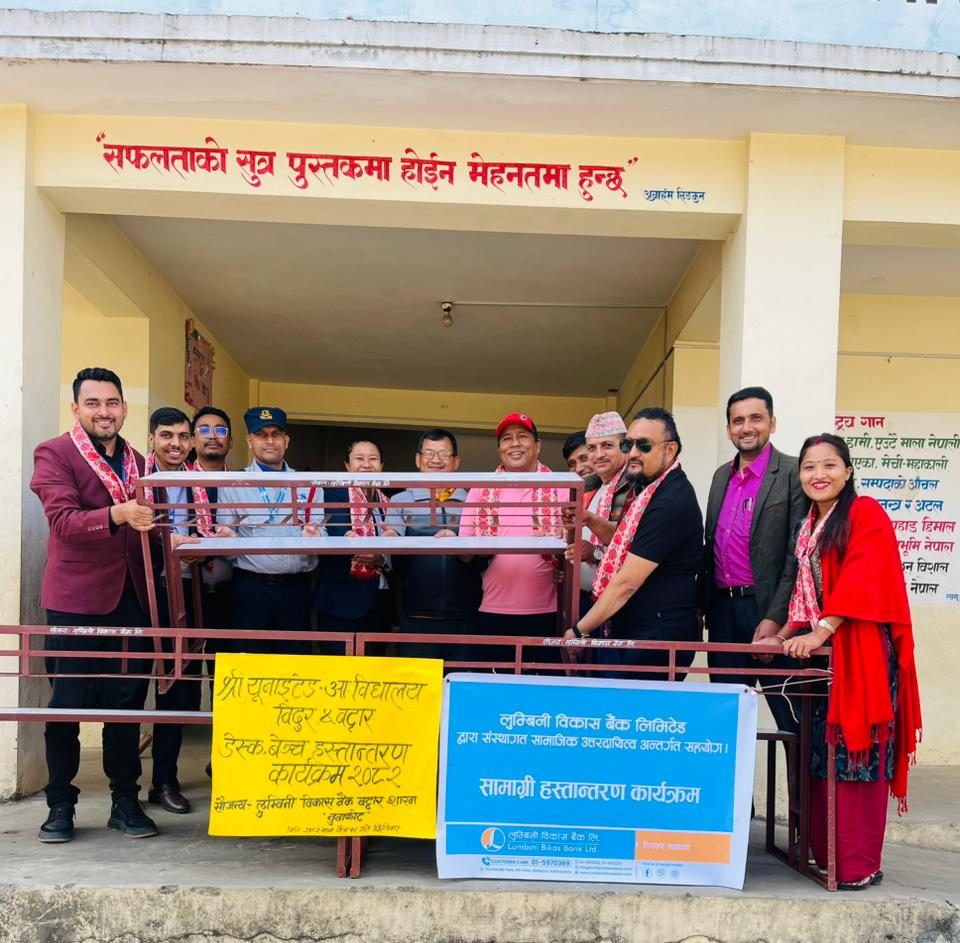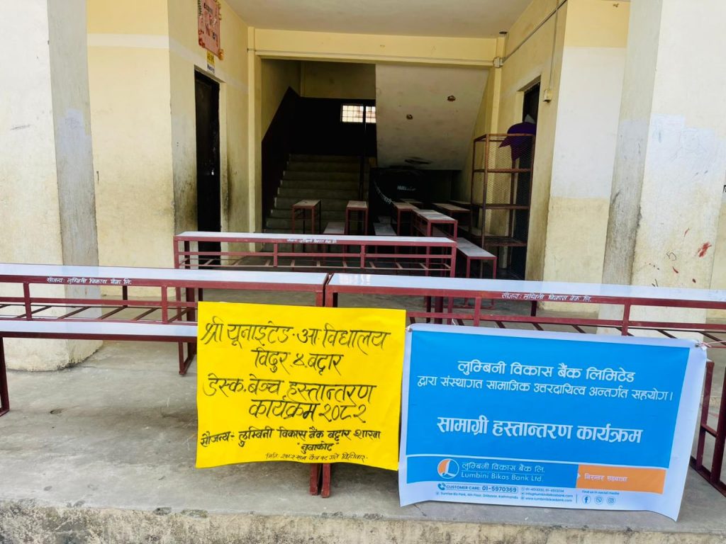 नुवाकोट । लुम्बिनी विकास बैंक बट्टार शाखाले विदुर नगरपालिका वडा नम्बर ४ बट्टारमा रहेको युनाइटेड आधारभुत विद्यालयलाई डेक्स बेन्च सहयोग गरेको छ ।