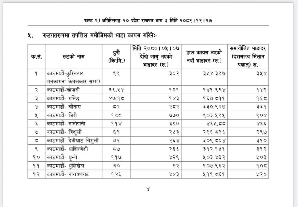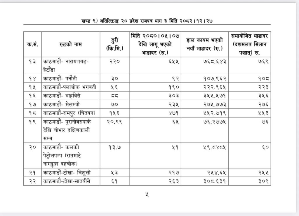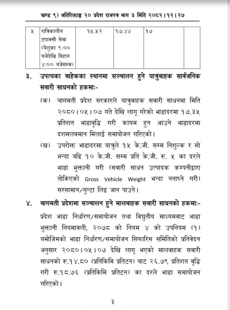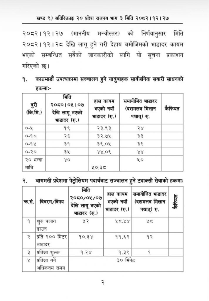 प्रदेश राजपत्रमा चैत्र २८ गतेदेखि लागुहुने गरी काठमाडौं उपत्यकासहित बागमती प्रदेशमा सञ्चालित सार्वजनिक सवारी साधनको भाडा वृद्धिदर सार्वजनिक गरेको हो ।
